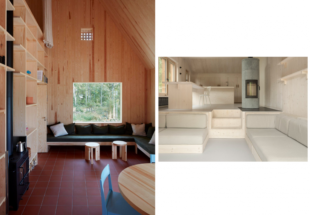 In projects where wood dominates the interior palette, the built-in sofa becomes a logical extension of the architecture. The Hee House in Sweden, by Studio Ellsinger, showcases a dramatically pitched roof and lofty interiors entirely lined with warm, untreated pine. The corner sofa’s base is similarly crafted from pine, ensuring visual continuity with the walls and ceiling. This deliberate uniformity is gently offset by deep green cushions, which introduce a grounding colour and textural softness against the pervasive wood.