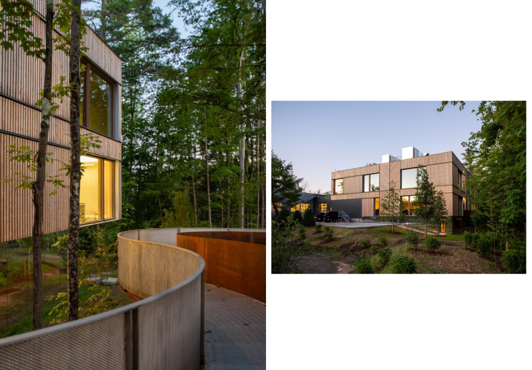 The exterior is clad in a rain screen made of sustainably harvested Atlantic cedar. However, the most striking element is the base level, which is wrapped entirely in mirrored panels. This treatment intentionally disrupts the perception of mass, causing the upper two stories to appear to “float lightly” above the landscape. The mirrored base reflects the surrounding forest, creating an effect the architects describe as supernatural and surreal, deeply integrating the building with its wooded site while preserving the nearby wetland.
