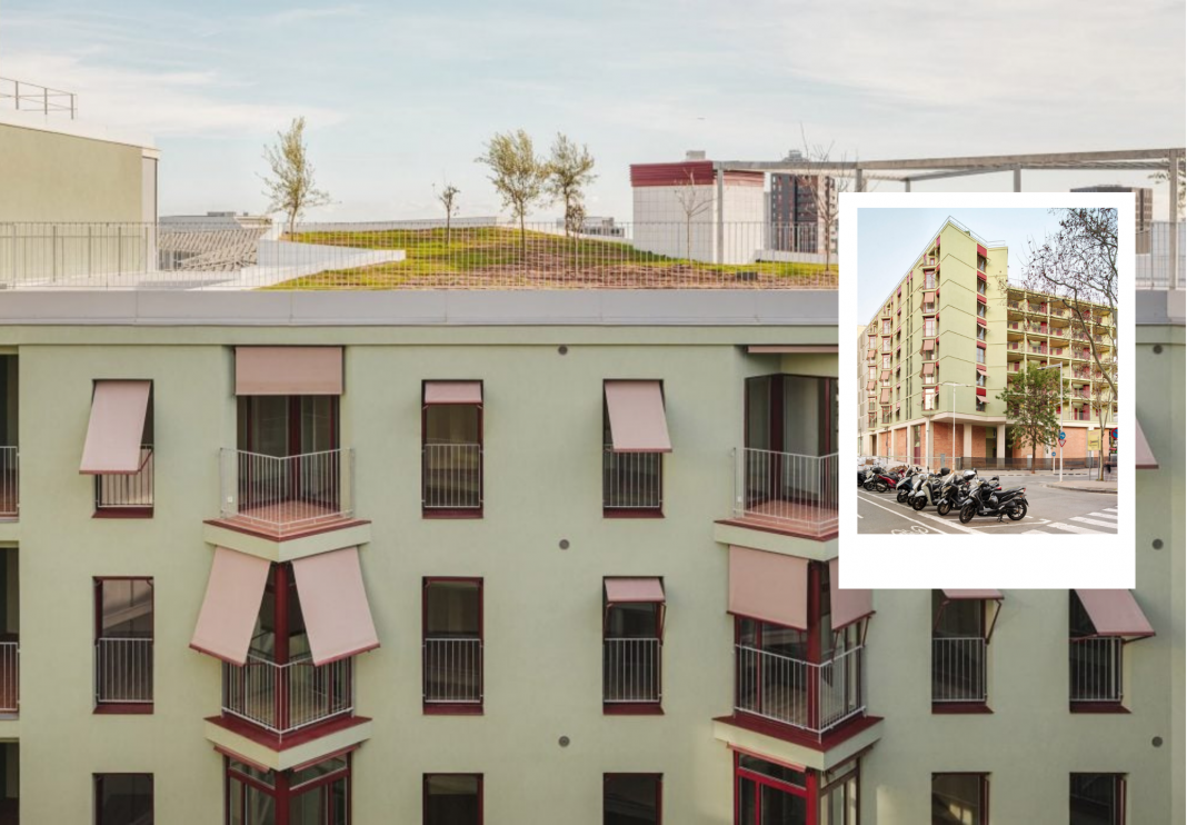 The ground floor, which houses commercial spaces and shared areas for children and the elderly, features a robust concrete frame infilled with classic brickwork, grounding the structure firmly in its urban setting. Above this base, the residential floors are finished in a pale, almost pastel green render. This soft background hue is dramatically punctuated by elements of bold red: the awnings, window frames, and doors. This high-contrast palette is not only striking but serves a functional purpose, with the red elements highlighting the balconies and access points, adding a vibrant energy to the facade. Furthermore, the commitment to sustainability and communal well-being extends to the roof, which has been transformed into a “verdant oasis.” This green rooftop not only provides shared recreational space but also helps the building counteract excessive urban heat, making it a functional component of Barcelona’s climate-resilience strategy.