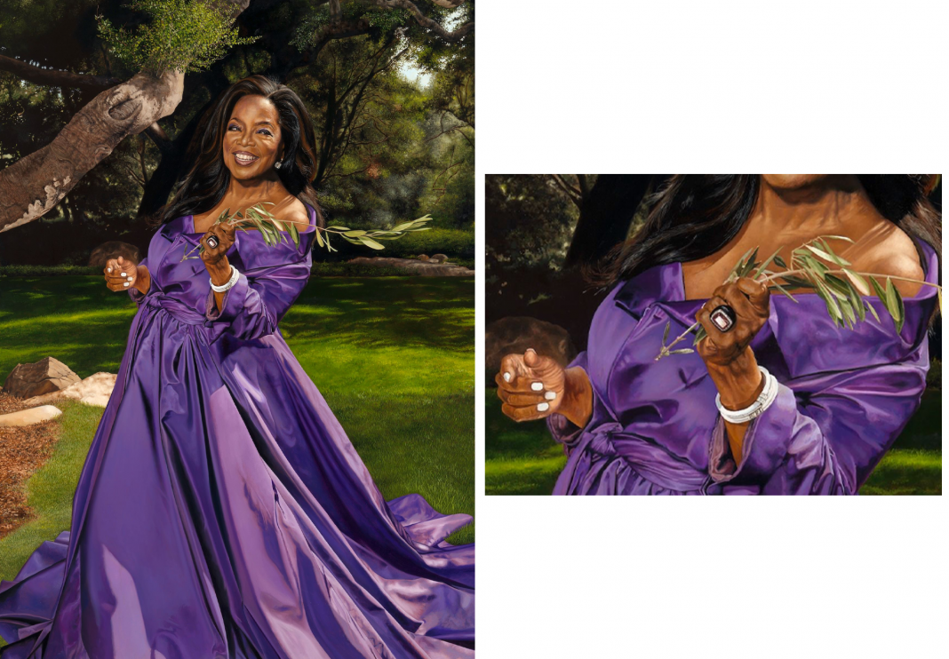 Furthermore, in her left hand, Winfrey gently holds an olive branch. This ancient symbol of peace, goodwill, and victory is a fitting emblem for a figure known globally for her philanthropic endeavors and her message of connecting with people to inspire them. The inclusion of the olive branch, combined with her broad, welcoming smile, successfully conveys the warm, generous, and optimistic spirit that the NPG sought to recognize, transforming a static image into a narrative of grace and powerful public influence.