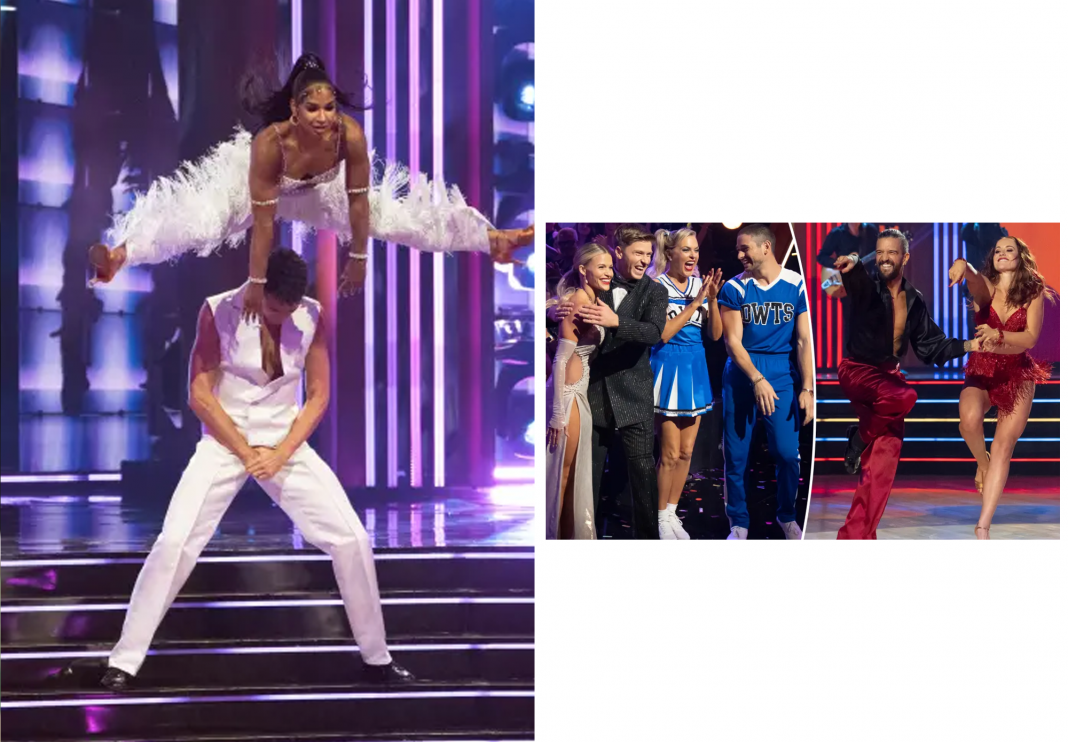 Jordan Chiles in a white feathered outfit jumping over Ezra Sosa, who is in a white vest and pants.